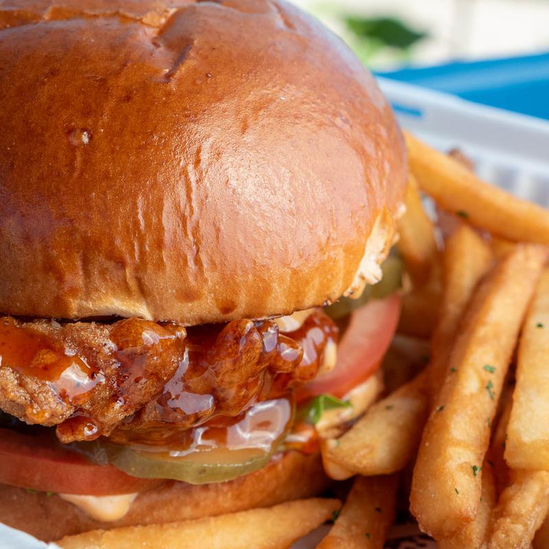 Buttermilk fried chicken breast, pickles, lettuce, tomato, hot honey, and spicy mayo on a brioche bun.