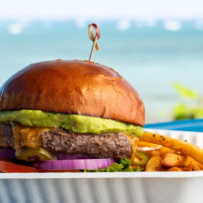 Beef patty, bacon, cheddar, and jerk aioli, grilled pineapples, BBQ sauce, brioche bun.